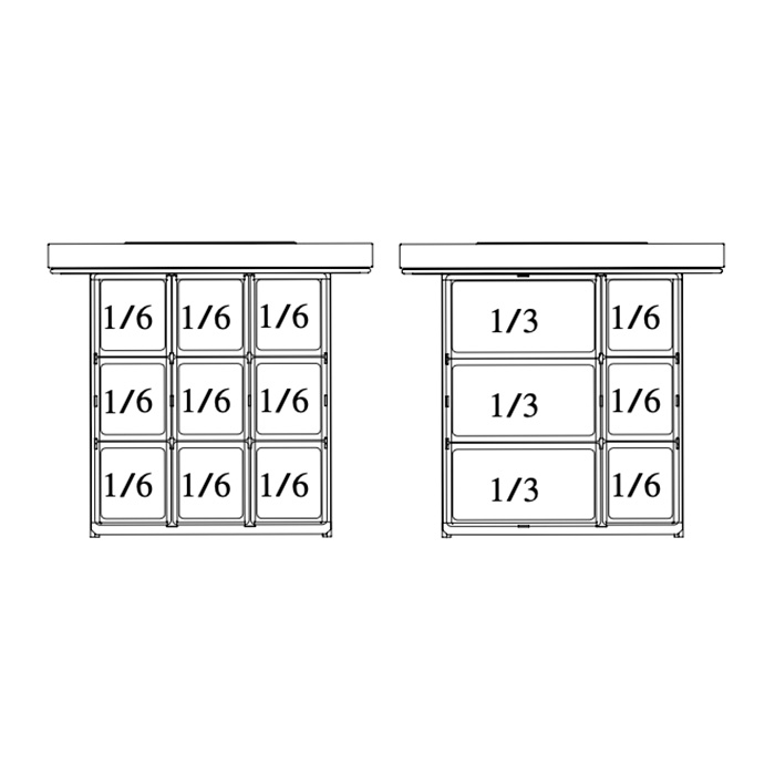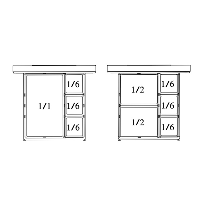 - Cajones diseñados para bandejas gastronómicas de 4” de profundidad (no incluidas), con rieles deslizables de alta resistencia y gran capacidad de carga.
